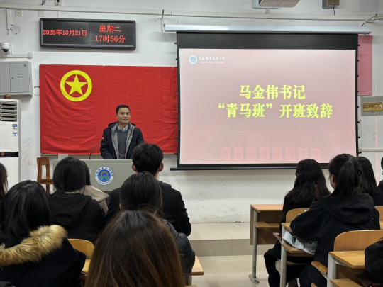 仪式在庄严的国歌声中拉开帷幕。马金伟首先作开班致辞,他对全体“青马班”学员的加入表示祝贺,同时强调了“青马班”作为“青年马克思主义者培养工程”重要载体的意义。他提到,学院始终将青年政治素养培育放在育人首位,“青马班”正是为有志青年搭建的 “学思想、强信念、重实践”的成长平台。并对学员提出三点要求:一是要筑牢思想根基,把读原著、学原文、悟原理作为日常习惯,真正理解马克思主义的核心要义;二是要立足实践成长,主动参与学院志愿服务、社会调研等活动,将理论知识转化为解决实际问题的能力;三是要扛起青年担当,以“青马人”的标准严格要求自己,在学风建设、校园文化等方面发挥先锋模范作用。