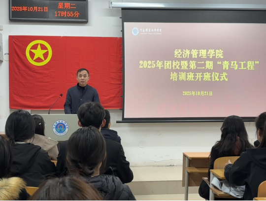 为深入学习贯彻习近平新时代中国特色社会主义思想,加强青年骨干理想信念教育,筑牢青年成长成才的思想根基,10月21日,经济管理学院2025年团校暨“青马工程”培训班开班仪式在2201教室举行,学院党总支书记马金伟、副书记韩雪平、团总支书记张文龙、辅导员代表及30名院“青马班”学员参加了开班仪式。仪式由张文龙主持。