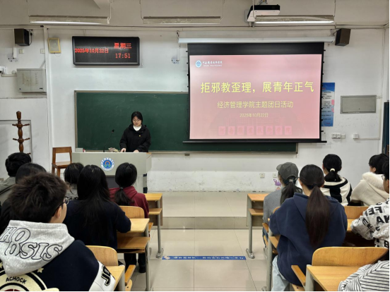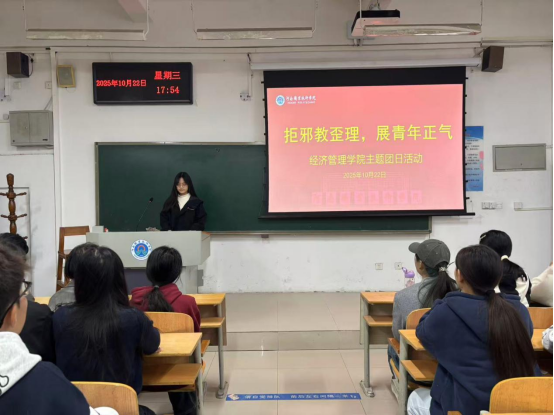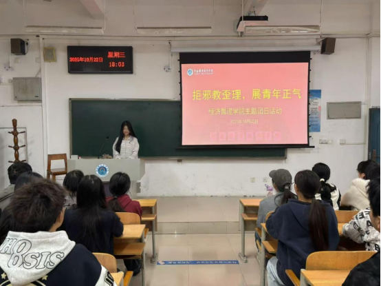 为深入学习贯彻总体国家安全观,切实提升青年团员识别抵御邪教侵蚀的意识和能力,营造崇尚科学、反对邪教、文明和谐的校园文化氛围,10月22日下午,经济管理学院组织25级团员代表,在1105教室开展了一场以“拒邪教歪理,展青年正气”为主题的团日活动。
