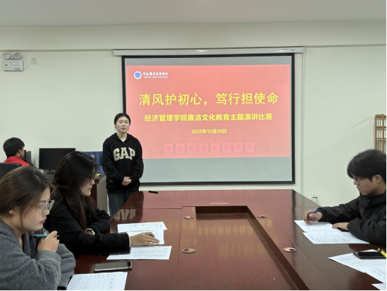 为深入学习贯彻全面从严治党要求,大力弘扬廉洁文化,引导广大青年学生树牢廉洁自律意识,10月30日,经济管理学院在笃行楼625成功举办廉洁文化教育主题演讲赛。此次活动得到全院学生积极响应,吸引了来自各专业的同学同台竞技,他们以铿锵之音传递廉洁理念,以真挚感悟诠释清风正气,为现场观众呈现了一场兼具思想性与感染力的廉洁文化盛宴。