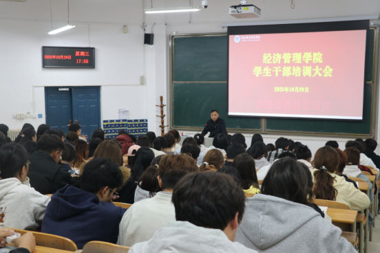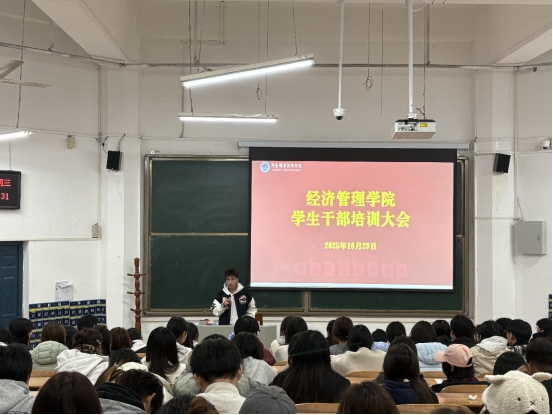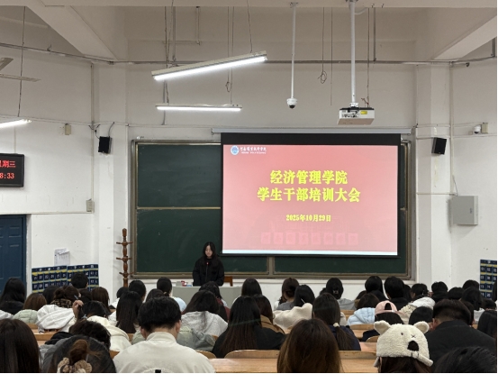 为进一步提升我院学生干部的工作能力和业务素养,提高服务学生的思想意识,增强学生干部的责任感和使命感,发挥学生干部的桥梁作用,10月29日,经济管理学院在电教楼103教室召开学生干部培训会议,学院学生会全体成员以及24、25级班长和团支书参加培训,团总支书记张文龙负责培训。