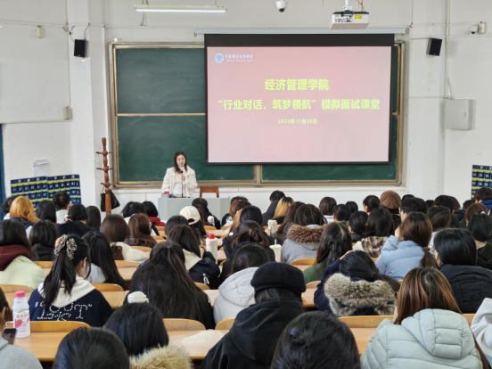 紧接着,“行业对话 筑梦领航”模拟面试课堂火热开展。学院特邀请具有实战经验丰富的资深企业人士北京七月森林科技有限公司总经理吴明月,围绕经济管理类热门岗位设置了无领导小组讨论、结构化面试两大核心环节。参与学生以小组为单位,围绕“企业数字化转型中的人才需求”等议题展开激烈讨论,展现出扎实的专业素养和清晰的逻辑思维。针对同学们存在的“答题角度单一”“时间把控不足”等问题提出改进建议,并现场演示了优秀面试应答的逻辑框架,让同学们直观感受面试技巧的核心要点。