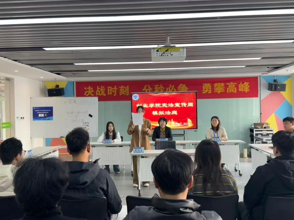 活动开始,创业学院于12月1日组织开展了针对教职工的法治宣传教育活动,创业学院副院长温宗和带领创业学院教职工进行了“创业学院学习贯彻习近法治思想宪法宣传教育”会议,强调了法治教育的重要性。随后,在12月4日,秦瑞军老师针对全院入驻项目学生进行了普法会议,结合创业实际,剖析相关法律风险与规范。同日,卢雨佩老师组织了宪法晨读活动,带领各入驻项目负责人集体诵读宪法条款,感受宪法的庄严与权威。理论教育环节结束后,活动转入实践与深化阶段。学院在12月5日,策划了模拟小法庭活动,教职工和入驻项目的法人共同扮演法庭角色,完成了一起小微企业民事诉讼的模拟法庭。随后,各入驻项目法人代表围绕“小微企业经营中常见经济纠纷的防范与化解”展开专题讨论,大家结合自身实践交流经验,共同探索依法合规的经营路径。