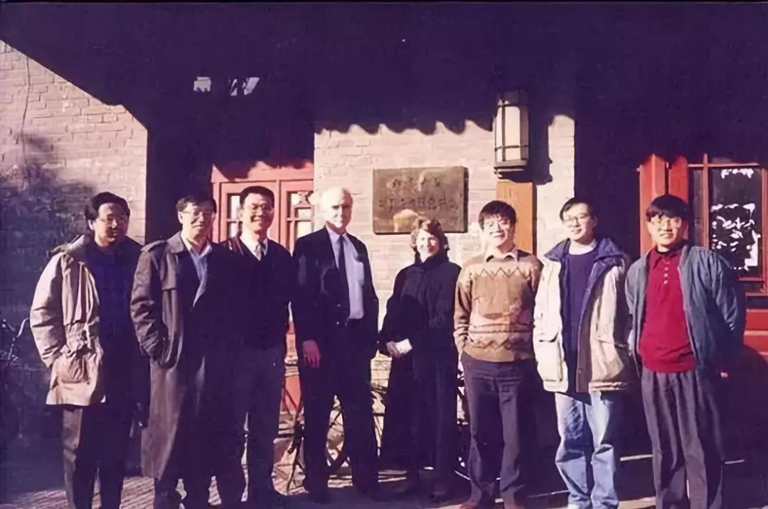 1994年中国经济研究中心成立初期合影(左起:张帆、易纲、林毅夫、德怀特•帕金斯、帕金斯夫人、海闻、余明德、张维迎)