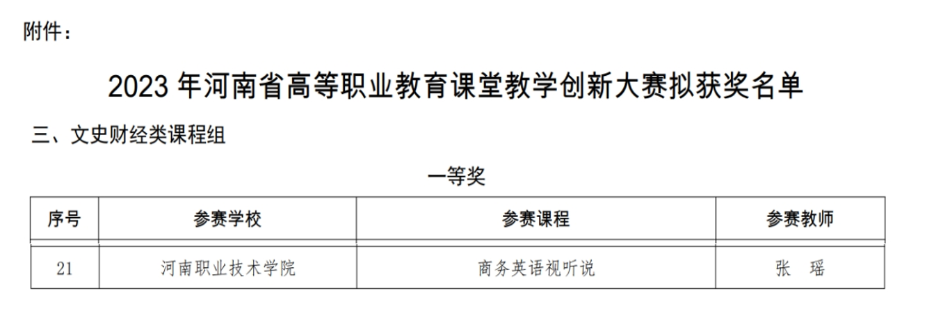 2023年11月7日至9日,由河南省教育厅主办的2023年河南省高等职业教育课堂教学创新大赛(文史财经组)现场决赛在南阳医学高等专科学校举行。在学校的高度重视和我院的鼎力支持下,我院教师张瑶经过校赛脱颖而出,最终入围省决赛,经省级网络评审和现场比赛等环节,在全省400余名教师参赛的情况下,喜获文史财经组一等奖,充分展现出我院教师的教学技能水平和良好的精神风貌。