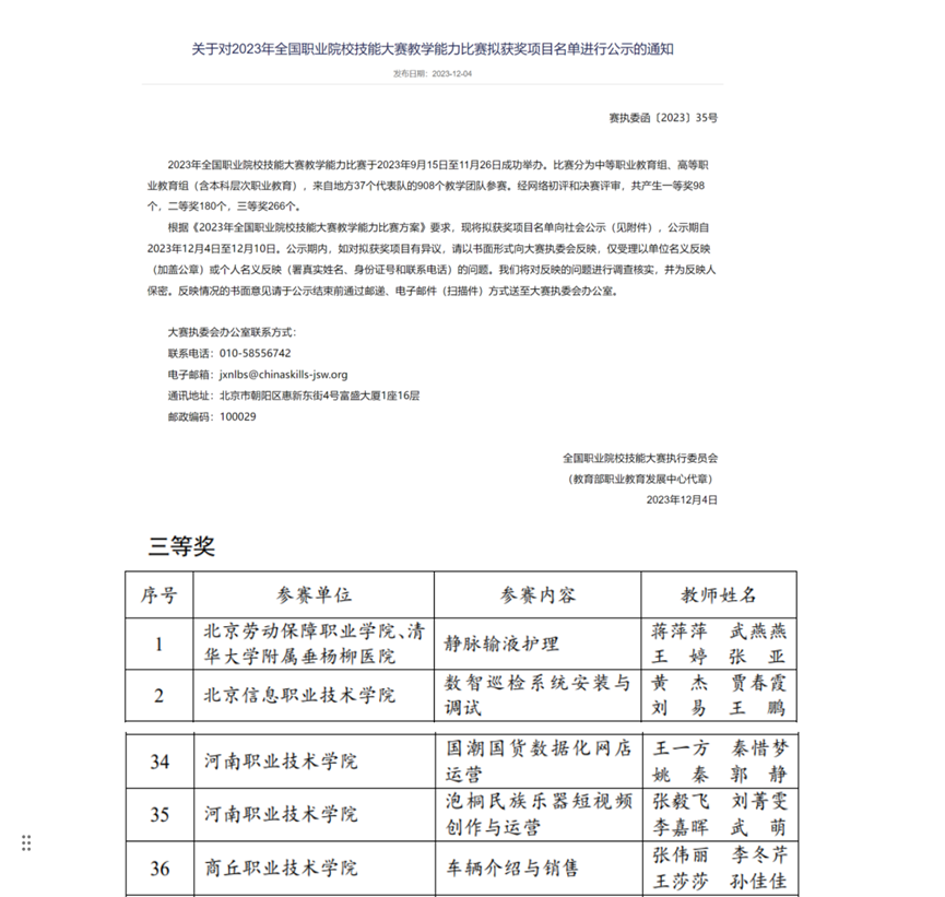 11月25日,由教育部主办的2023年全国职业院校技能大赛教学能力比赛决赛圆满落下帷幕,全国共有784所院校908个教学团队、3582位教师参加了比赛。从2023年全国职业院校技能大赛教学能力比赛拟获奖项目名单中获悉,电商物流学院王一方、秦惜梦、姚秦、郭静团队的《国潮国货数据化网店运营》作品荣获国赛三等奖,实现我院在此项赛事中的新突破。