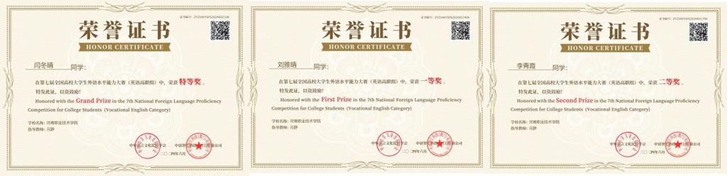 我院商务英语专业教研室秉持“以赛促教、以赛促学、以赛促练”的理念,积极组织学生参加了本次大赛高职组的报名,初赛报名人数达到50人,最终有10名选手入围全国总决赛。入围决赛同学在元静老师的指导下,备赛热情高涨,夜以继日、勤学苦练。功夫不负有心人,在6月1日(周六)的全国总决赛中,1名学生荣获特等奖,1名学生荣获一等奖,4名学生荣获二等奖。