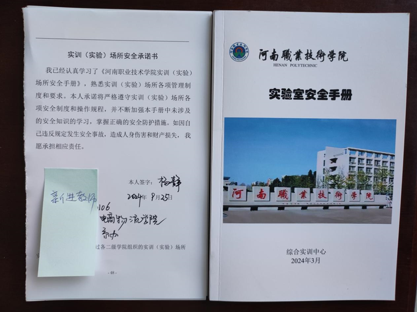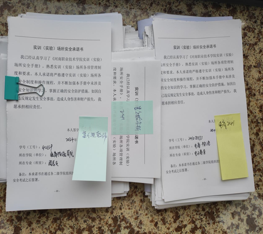 此外,学院还安排了签订实训(实验)场所安全承诺书的环节。每位师生都仔细阅读了安全承诺书并在承诺书上签下了自己的名字,这不仅是对自己负责的表现,也体现了对他人安全的尊重和保护。