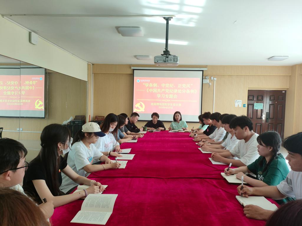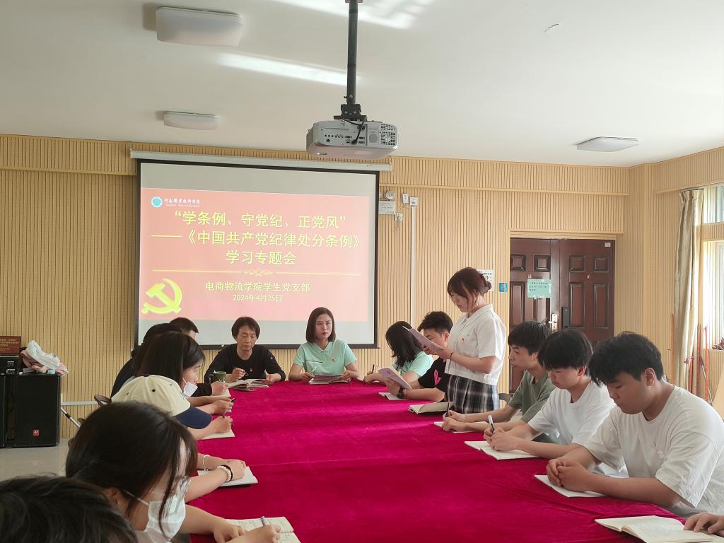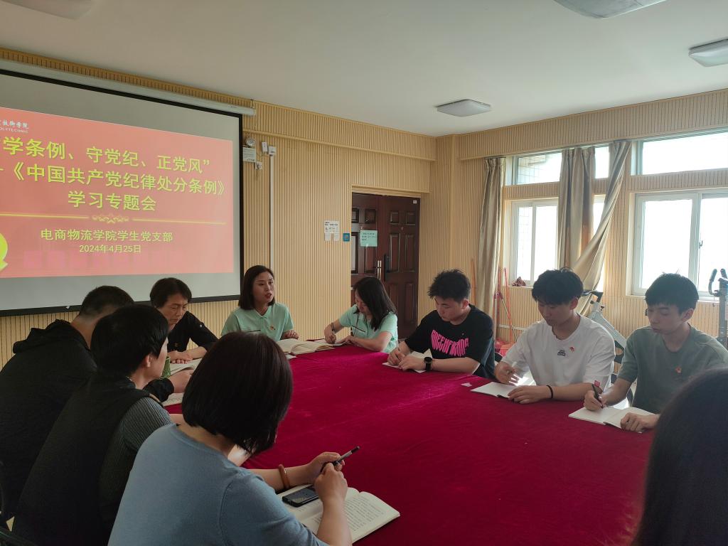 张佳首先传达了学校党纪学习教育部署会会议精神,宣读了《中共河南职业技术学院电商物流学院总支部委员会在全院党员中开展党纪学习教育的实施方案》和学生党支部党纪学习教育工作计划。带领大家学习了楼阳生书记在省委党纪学习教育读书班上作的专题党课主要内容,强调在广大党员中开展《中国共产党纪律处分条例》学习教育活动,是为推动党员干部学纪知纪明纪守纪,始终保持忠诚干净担当,推进中国式现代化建设提供坚强纪律保障。随后,与会代表开展了《条例》内容领学,重点学习了第二章《违纪与纪律处分》,使同学们更加了解违纪与纪律处分的相关条例。最后,全体党员结合学习、工作实际就学习收获进行了分享。(供稿:张佳,审稿:解鹏程)