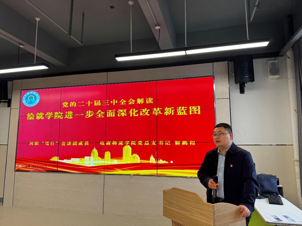 为深入学习宣传贯彻党的二十届三中全会精神,根据校党委统一部署,11月11日下午,河南职院学习贯彻党的二十届三中全会精神“笃行”宣讲团成员、电商物流学院党总支书记解鹏程为学院师生宣讲党的二十届三中全会精神。学院全体教师、学生预备党员和入党积极分子参加宣讲会。