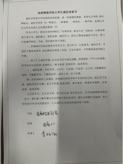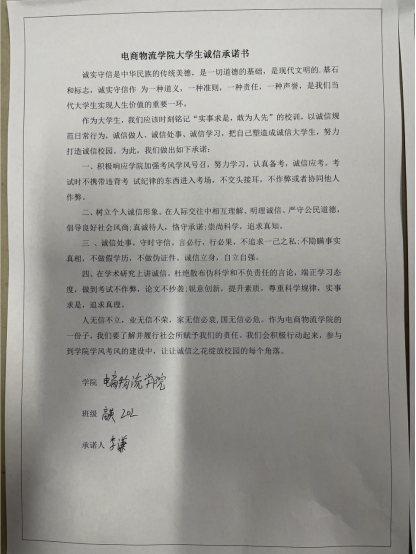 辅导员积极围绕推进“坚守诚信 同心抗疫”主题,组织各班召开诚信教育主题班会,将诚信教育活动与院风传承、学风建设、文明校园建设相结合,“秉信立行”观念融入抗疫实际和日常生活,组织学生通过签订“诚信承诺书”活动,促进广大学生自觉在道德上率先垂范,树立诚信意识,提升个人素养。计划本月将组织“诚信校园行”学生资助知识竞赛活动,展现电商物流学院学生明德立信、自立自强、拼搏向上的青春风采,增进了同学们对国家资助知识的了解,培养了正确的价值观、成才观,树立了感恩意识和社会责任感,让诚信之风在拂润校园,让诚信之花绽放校园的每个角落。