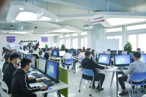 VBSE跨专业综合实训室,共有100个实训工位,配备了VBSE跨专业综合实践和ARE虚拟仿真两个教学平台。