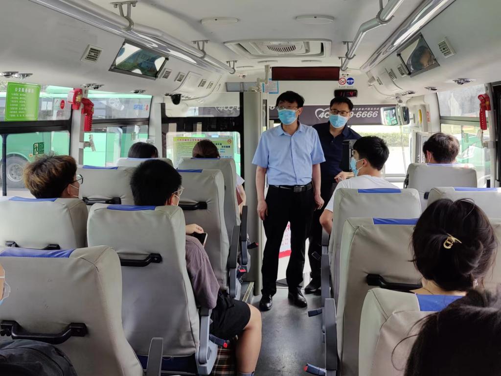5月26日下午,校长梅乐堂亲临学院点对点闭环送站服务现场,在送站大巴车上与离校学生进行亲切交谈,梅校长对离校学生叮嘱道:“第一,在回家的过程中一定要注意安全问题,特别是要注意防疫,带好口罩;第二,回到家后要第一时间通知自己的辅导员,让辅导员知道你们已经安全到家;第三,回家后要根据课程安排,按时参加线上网课学习,完成本学期剩余的课程;最后,祝同学们一路顺风,平安到家!”
