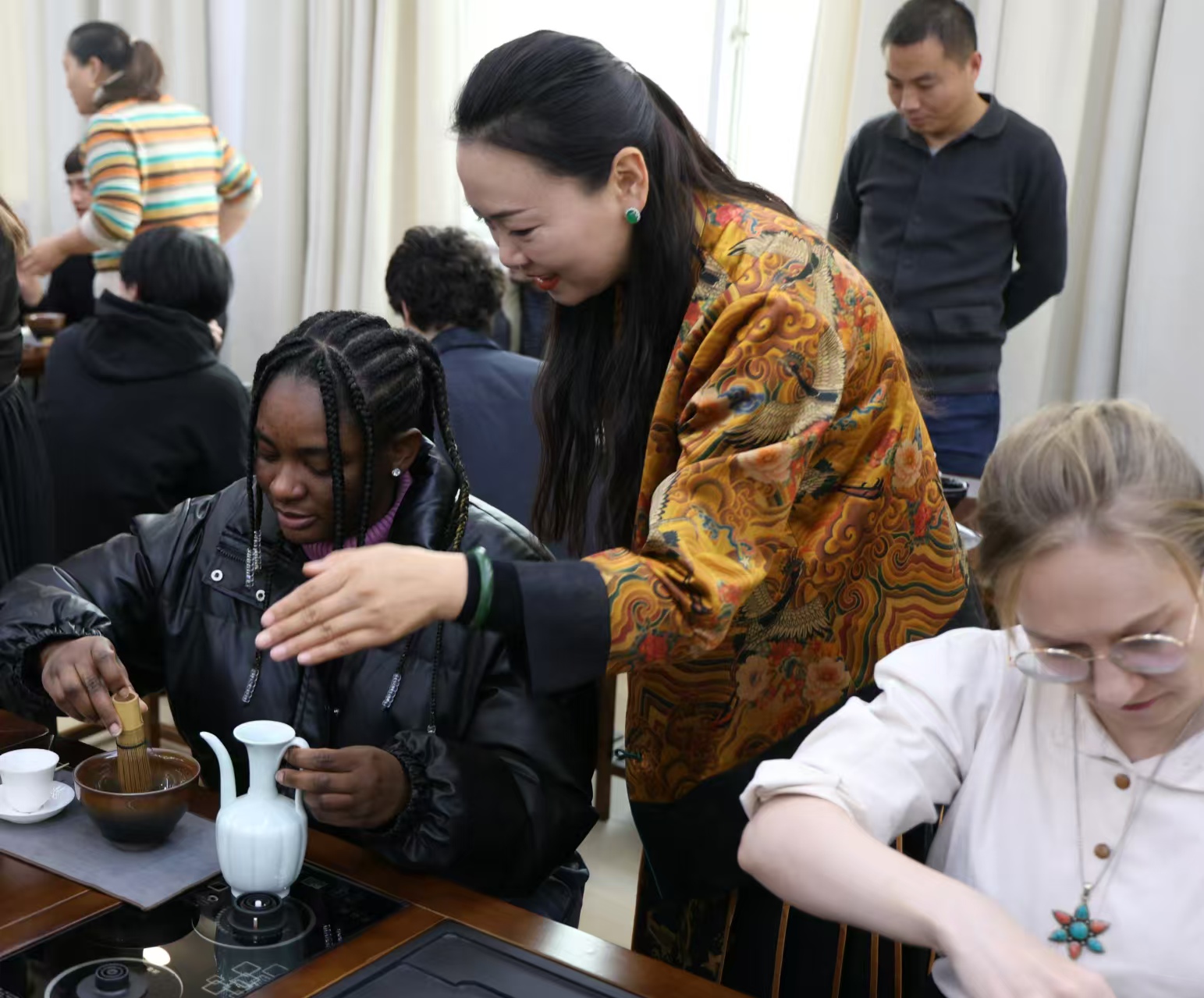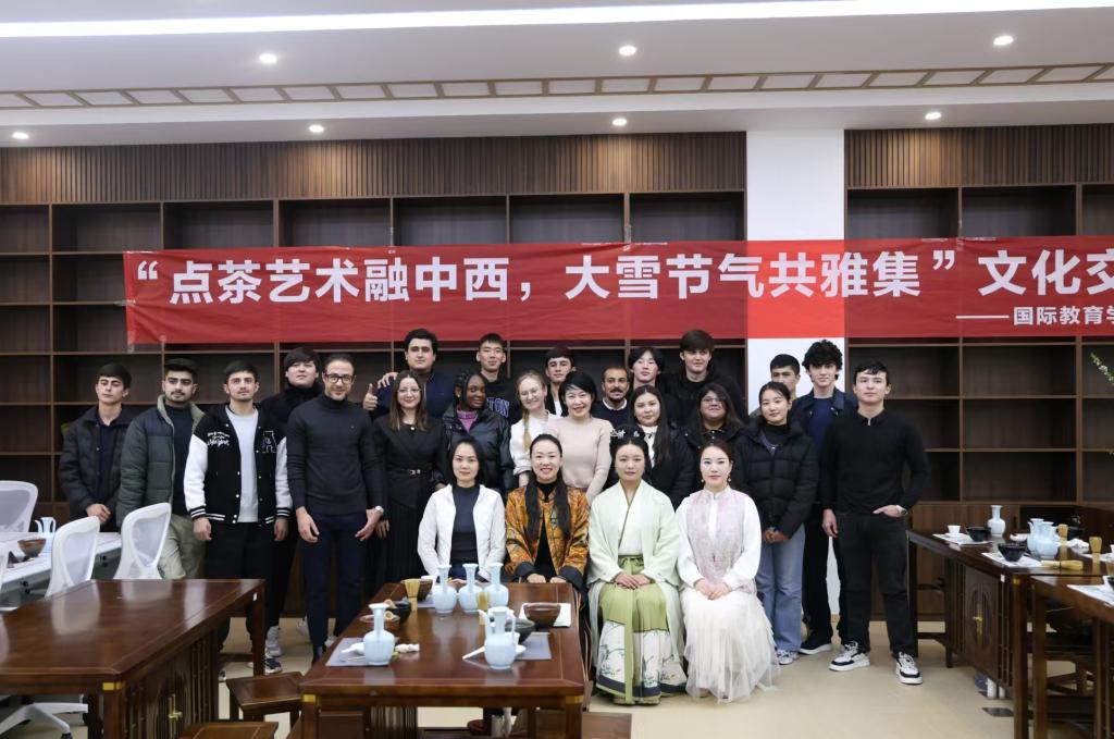 12月12日下午,国际教育学院在301教室举办了主题为“点茶艺术融中西,大雪节气共雅集”的文化交流活动。国际教育学院及国际合作交流处全体人员、外籍教师和来华留学生等40余人参加了此次活动。