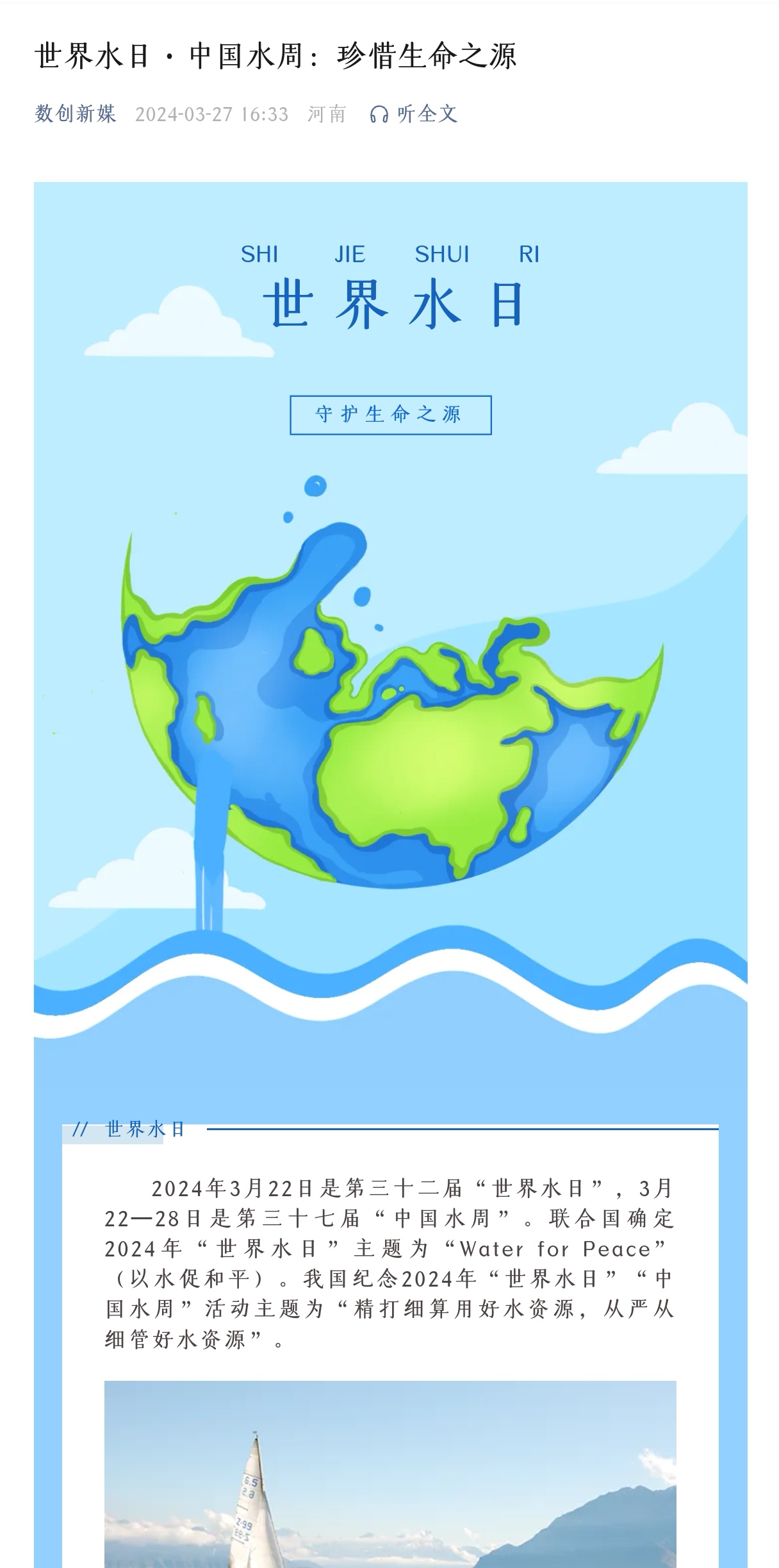 2024年3月22日是第三十二届“世界水日”,3月20日-28日是第三十七届“中国水周”。联合国确定2024年“世界水日”主题为“Water for Peace”(以水促和平),我国纪念2024年“世界水日”“中国水周”活动主题为“精打细算用好水资源,从严从细管好水资源”。为推进节水宣传进学院,建设节水型学院,提升师生节水意识,倡议广大师生对水资源保护的关注,倡导水资源的可持续利用,深入贯彻绿色发展理念,提升水资源保护意识,营造全民节约用水的良好氛围。数字创意与设计学院认真组织部署,围绕宣传教育、节约用水等方面开展系列宣传活动,通过微信公众号、宣传条幅、组织师生开展知识竞答等方式,宣传水资源管理等相关法律法规,导师生牢固树立用水、节水、护水,从你我做起的良好意识。