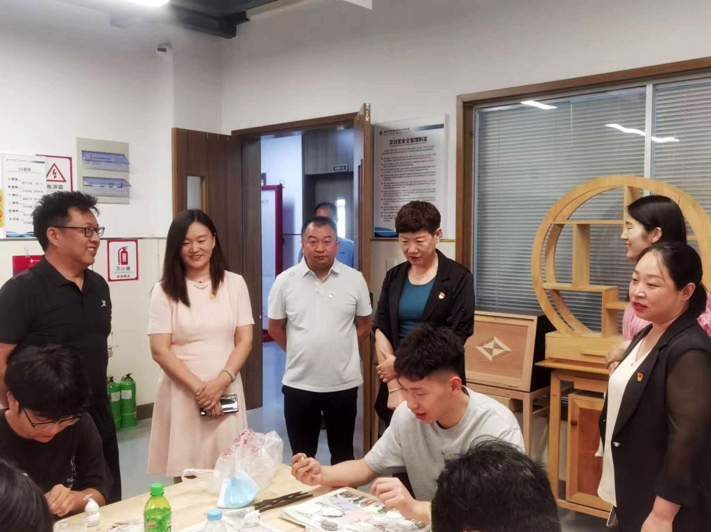 段文花一行首先参观了合鼎楼六楼木工大师工作室和文创产品艺术工作室、未来媒体技术工作室、虚拟演播厅等,深入了解了我院实训室建设及工作成果。