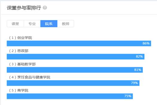 各教学单位课堂参与率最高为86%,平均值为75.4%,与前两周基本持平。