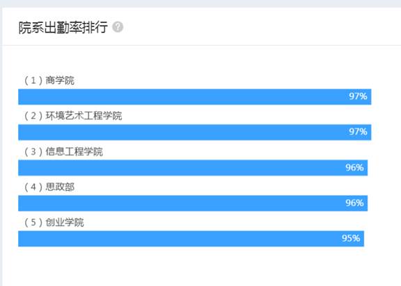 各教学单位出勤率最高为97%,平均出勤率为94.25%,与前两周基本持平。