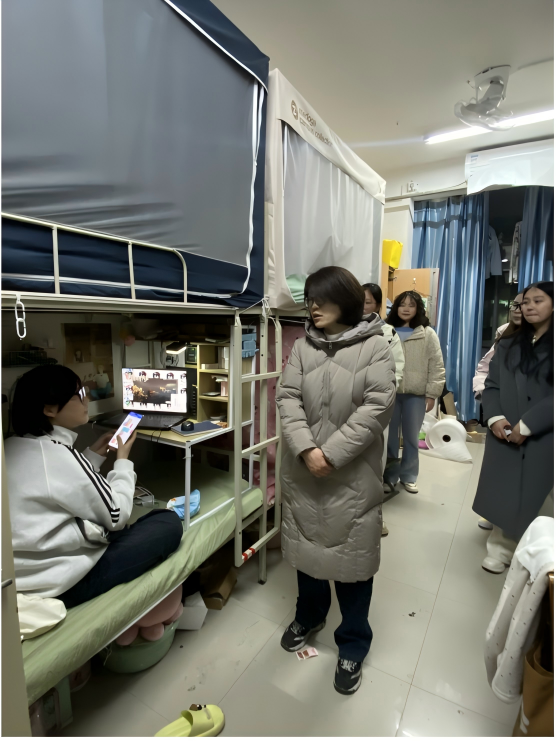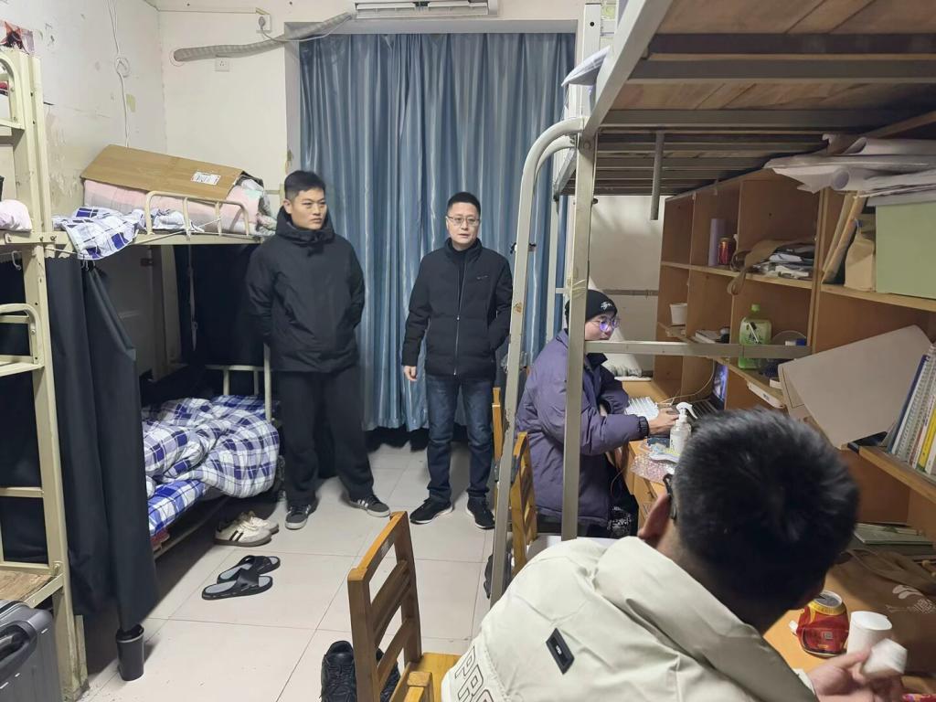 走访过程中,老师和同学们进行亲切交谈,重点围绕学生返校适应情况、宿舍安全卫生、学业规划及生活需求等方面展开细致沟通。老师们逐一查看寝室设施,排查安全隐患,叮嘱学生注意用电安全、保持环境卫生,并对部分宿舍的报修问题现场协调解决。
