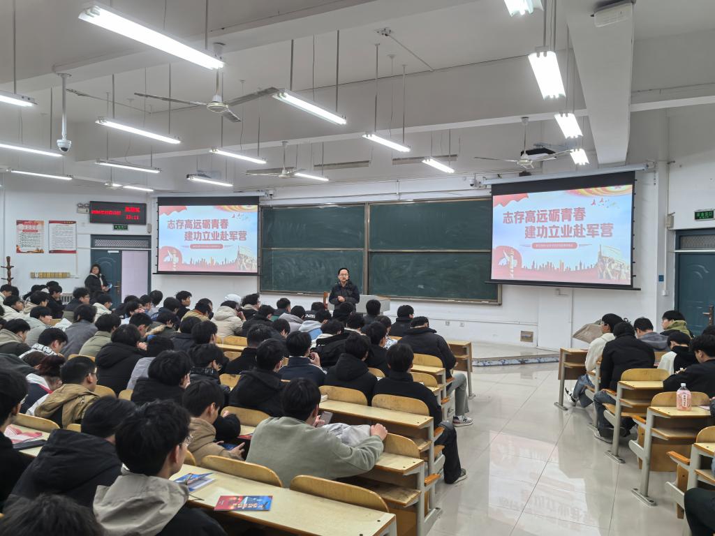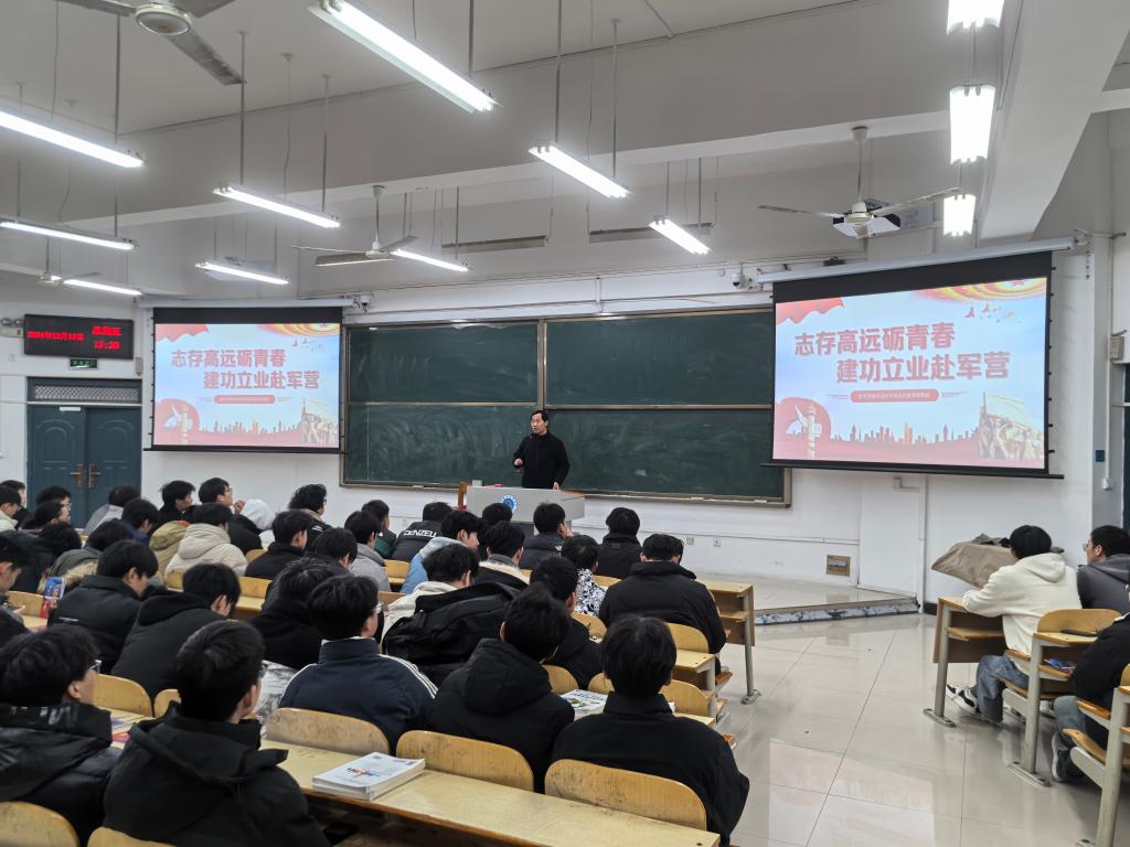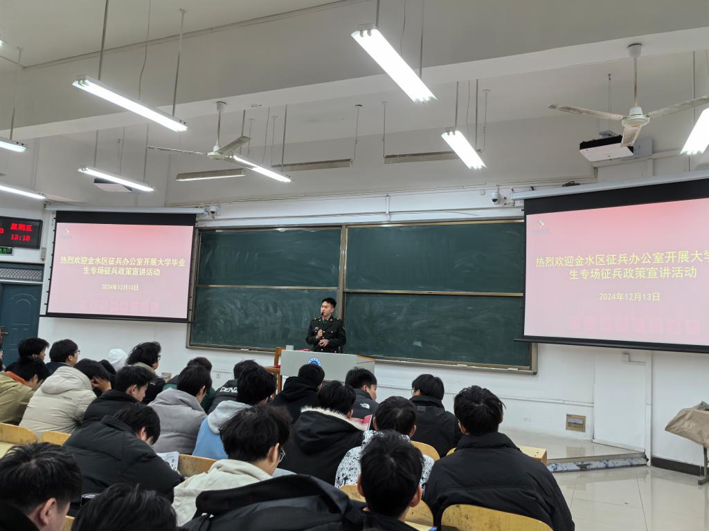 12月13日,在明理楼1204教室,金水区武装部康倍儒、党委学生工作部刘明库、招生就业处王红胜三位老师以“志存高远砺青春,建功立业赴军营”为主题,分别从参军入伍的时代背景、入伍前的准备、入伍后的军旅生涯及退役后的高质量就业和福利待遇等方面向同学们进行宣讲和答疑解惑,鼓励在场的青年大学生积极从军,为国家事业奋斗。