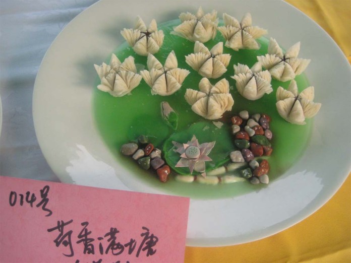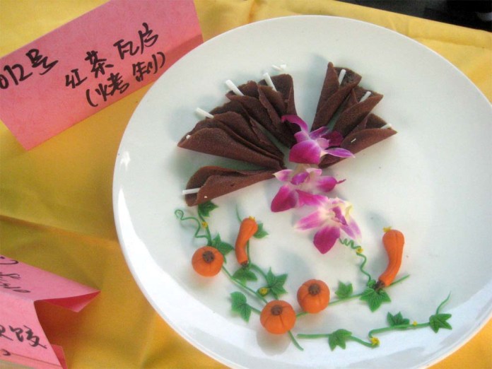 为迎接本届大赛,在旅游烹饪系领导高度重视和支持下,烹饪工艺与营养专业组成了7人的师生参赛队伍,前去群英荟萃,夺金摘银。本次大赛规则细化,要求严格,作品要富有寓意和创意。为此系领导陈佳平和刘志全主任专门召开了动员会,对参赛事宜做了整体部署,系办公室张北主任针对大赛事项和参赛作品设计进行了具体说明和精心指导。根据系里的要求参赛教师认真研究、专心设计,制定了具体训练方案,挑选了专业思想牢固、基本功扎实的学生,本着为学院争光、为系里添彩、学习进步、交流发展的目的,认真准备作品,反复练习。