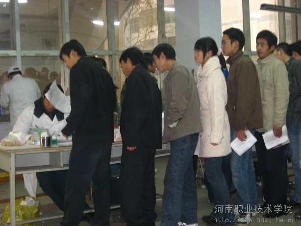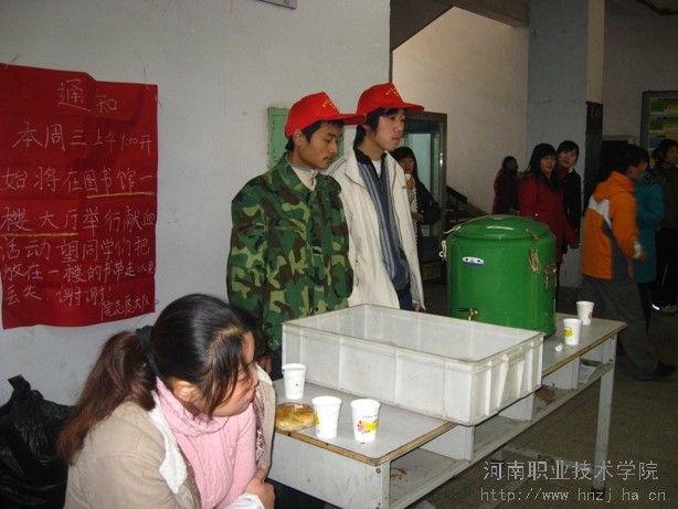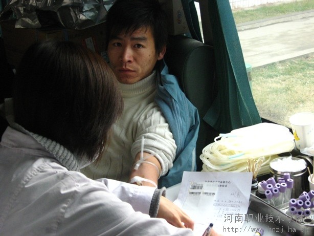 早晨8点整,省红十字协会献血中心的采血车准时来到我院图书馆前,车前等候献血的学生排成一字形长队。一字排开的桌子前,医生给献血的同学做体检:称体重、测脉搏、验血型……一群头戴小红帽的青年志愿者也忙得不可开交,组织学生排队体检,给献过血的同学送面包、递水……