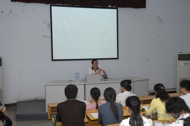 彭院长首先用生动形象的语言回顾了学院几十年艰难而又光辉的历程,接着分析了当前世界高等职业教育发展的现状和趋势,其中谈到我国高等职业教育与世界发达国家之间的差距时给大家留下了深刻的印象。讲授中彭院长采用了大量翔实的数据,一组组数据不仅说明了我国高等职业教育近十年来快速发展的现实,也展现了我院几十年发展所取得的巨大成就,这些成就令台下的每一位青年教师感慨,他们不时发出轻声惊叹,惊叹声中他们已不自觉地把自己融入到学院这个大家庭里。