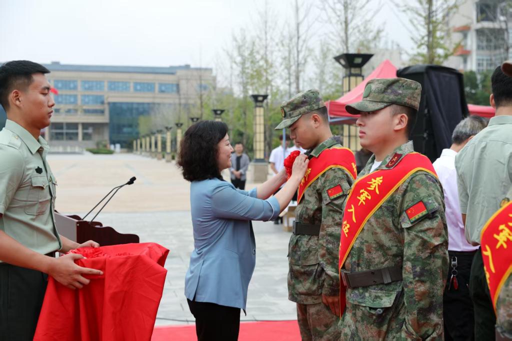 欢送会现场,夏新颜与李玉峰共同为15名应征入伍学生代表佩戴大红花并赠送鲜花,将学校的殷切期望与美好祝福传递给每一位准军人。