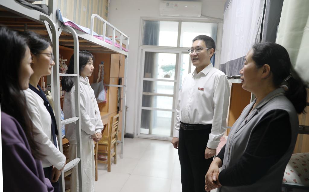 厉励一行走进学生宿舍园区,深入学生宿舍看望留校学生,并与学生们亲切交谈。每到一间宿舍,他都仔细查看消防器材是否完好有效、应急通道是否畅通,询问他们的假期学习计划、宿舍生活设施是否完好,同时叮嘱同学们要注意用电安全、保持宿舍卫生,遇到问题及时向宿管老师或辅导员反映。看到学生们在宿舍里安静学习、有序生活,他对宿管值班人员说:“宿舍是学生在校的‘小家’,你们24小时守护着学生的生活安全,这份细致与负责让家长放心、让学校安心。”他对宿舍管理工作提出要求,要加强假期宿舍安全巡查频次,重点排查用电安全隐患,严禁违规使用电器;同时要关注学生生活需求,及时解决宿舍设施故障等问题,为留校学生营造安全、舒适的住宿环境。