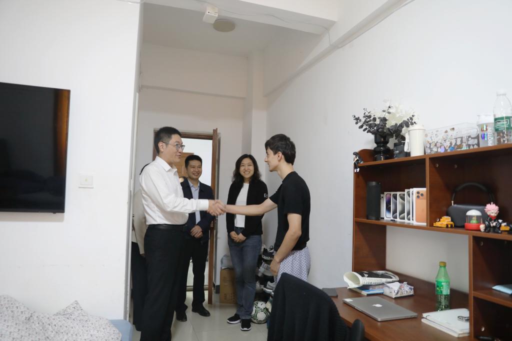 在健行楼8楼,厉励一行看望了留校的留学生。他走进留学生宿舍,与留学生们亲切交流,询问他们的假期生活安排、饮食起居情况,以及是否有需要学校协调解决的困难。得知留学生们都喜欢中国传统文化、喜欢中国饮食时,厉励欣慰地表示:“学校是你们在中国的‘家’,假期里也要让你们感受到家的温暖。”他向陪伴留学生的值班老师致谢:“感谢你们用心照顾留学生的生活,搭建起文化沟通的桥梁。”针对留学生管理工作,他叮嘱相关部门工作人员,外事无小事,一定要管理好、服务好、保障好留学生的学习和生活,持续关注他们的思想动态和生活需求,丰富假期文化活动,帮助他们更好地融入校园、了解中国,同时做好他们的安全宣传教育,确保度过一个充实又安全的假期。