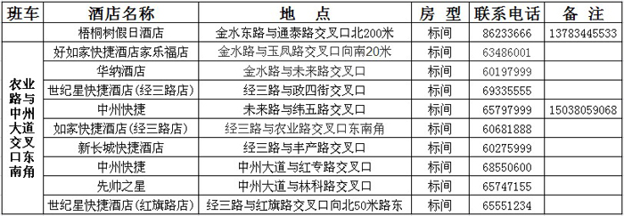 鉴于参赛队出行方便,学院专门为大家安排了班车(大型宇通客车,车身两侧印有“河南职业技术学院”字样),请大家提前前往班车发送点,发车时间为5月26日与27日早7:00,发车地点是农业路与中州大道交叉口东南角。其中,26日下午班车发送时间为12:30。(梧桐树假日酒店距离学院相对较近,乘坐班车没有直接去学院方便)