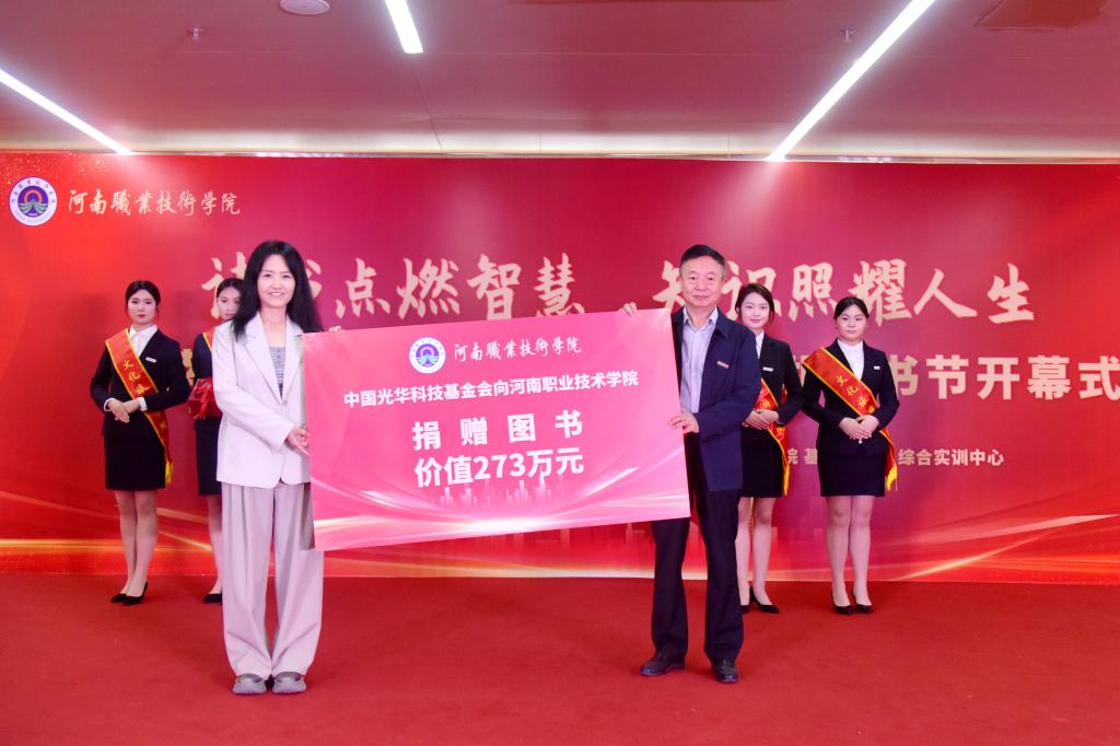 中国光华科技基金会科技事业中心主任钮海琴与河南职业技术学院校党委委员、副校长李玉峰进行图书捐赠交接