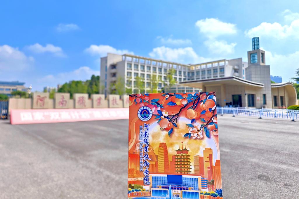 通知书封套正面“累累桃李”挂满枝头,生动诠释了学校“春风化雨,桃李满园”的教育理念,同时也寓意学校人才辈出,硕果累累。明湖的喷泉、图书馆以及实训大楼的独特风采,直观展示优美的校园环境与浓厚的学习氛围。远景巧妙融入河南文化地标“二七塔”与人文象征“炎黄二帝”雕像,明确昭示学校根植于历史悠久、文化底蕴深厚的河南大地。背景延伸处,现代都市高楼在浩瀚的苍穹宇宙映衬下林立,既彰显郑州作为现代化大都市的活力,更寓意学院立足河南、面向未来,培养具有广阔视野和创新精神的高技能人才。