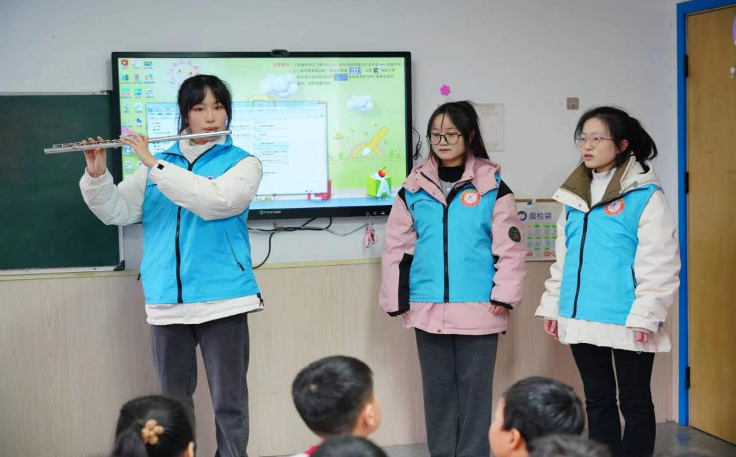 校团委联合音乐学院团总支带领团员青年走进郑东新区东尚社区龙湖花园幼儿园开展红歌传唱活动,器乐专业志愿者给小朋友们介绍乐器“长笛”的发源和构造,演奏曲目《歌唱祖国》;学前教育专业志愿者为孩子们演唱歌曲《祖国祖国我们爱你》,教小朋友认识国旗、学唱国歌;最后在游戏《传声筒》的欢声笑语中结束了本次活动。