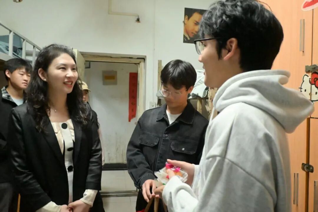 在学生宿舍,房静关切询问同学们的留校生活:“中秋没回家,有没有和家人视频道声祝福?”“餐厅的中秋餐合口味吗?”一句句暖心问候,瞬间拉近了与学子的距离。她还叮嘱大家要珍惜假期时光,合理规划学习与休息,若遇到学习或生活上的困难,一定要第一时间向学院反馈。房静、王爱巧亲手为每位留校学子递上包装精美的月饼,小小的月饼包裹着学院的牵挂,承载着学院的祝福,让学子们在异乡校园中,真切感受到节日的暖意。