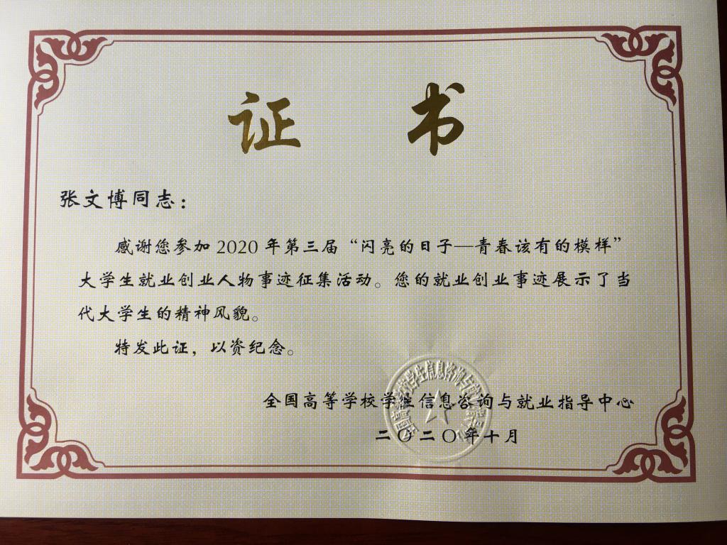 近日,教育部全国高等学校信息咨询与就业指导中心公布第三届“闪亮的日子——青春该有的模样”全国大学生就业创业先进人物评选结果,我校旅游学院2020届毕业生张文博成功获评。张文博是我省获评5人中唯一一名高职高专院校毕业生代表。