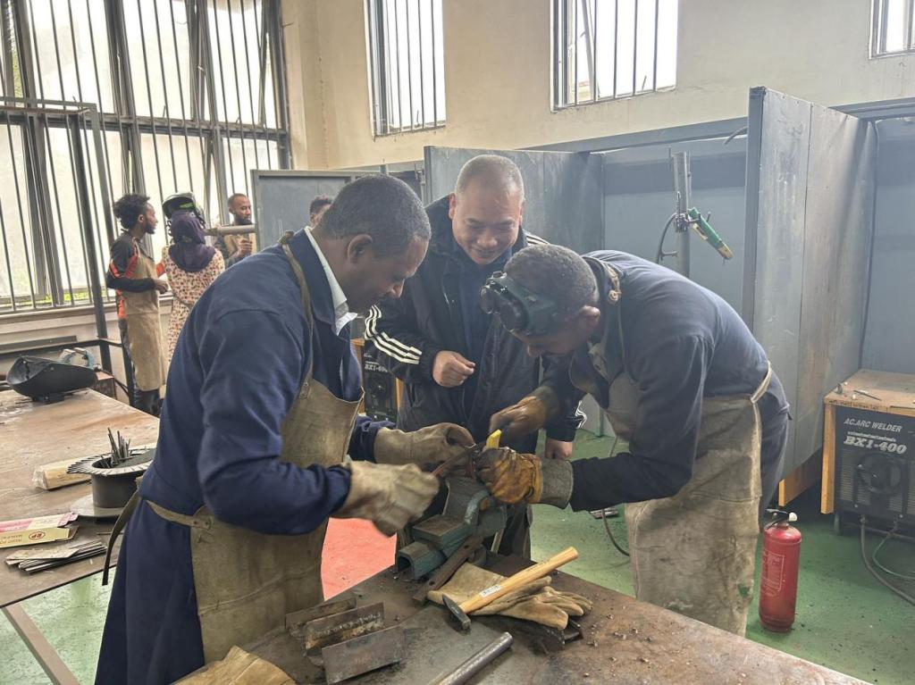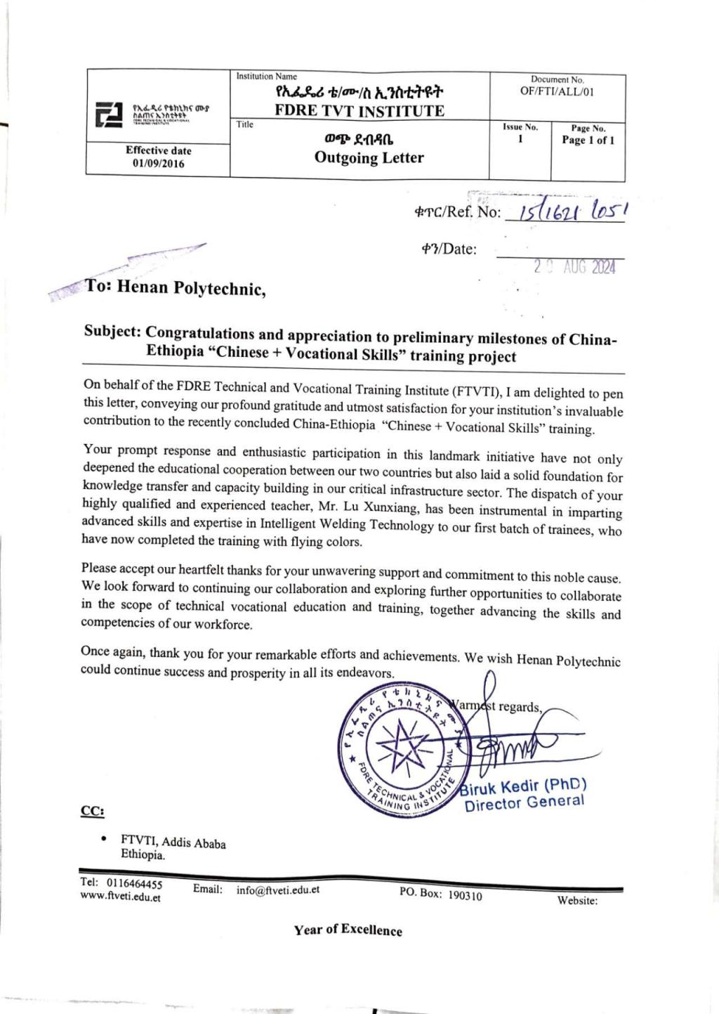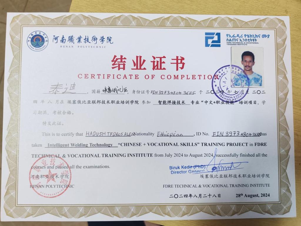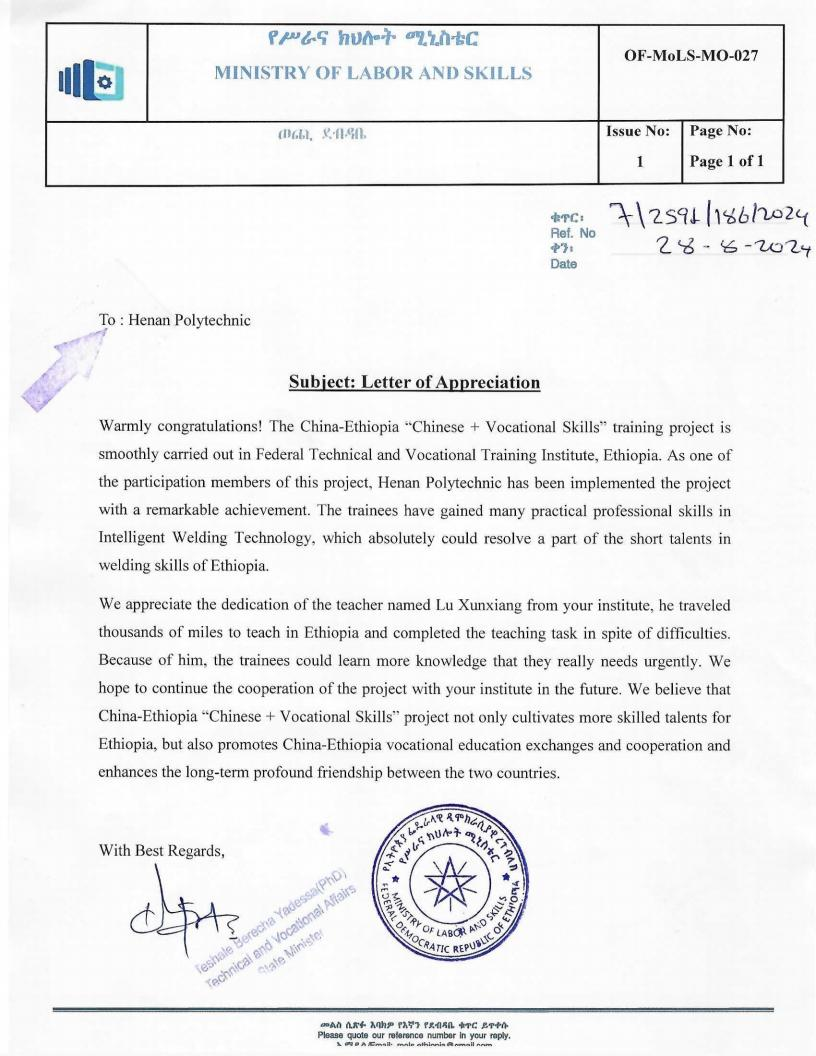 在第40个教师节来临之际,河南职业技术学院收到了来自埃塞俄比亚劳动与技能部和联邦技术职业培训学院的感谢信。信中写道:感谢你们为中国-埃塞俄比亚“中文+职业技能”项目所做的贡献,感谢经验丰富、热情耐心的鲁训祥老师给我们传授了先进的智能焊接技术技能和专业知识……