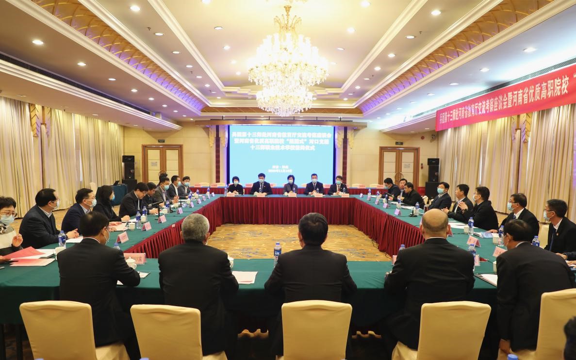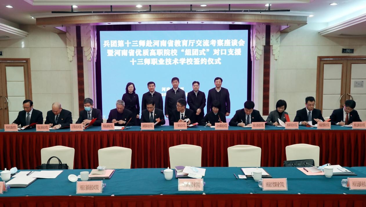 11月10日,兵团第十三师赴河南省教育厅交流考察座谈会暨河南省优质高职院校“组团式”对口支援十三师职业技术学校签约仪式在郑州举行。兵团第十三师党委副书记、师长鄂宏达,兵团第十三师党委副书记、副师长、河南省对口援疆工作前方指挥部副总指挥、党委副书记、纪委书记杨建国,兵团第十三师党委常委、副师长、河南省对口援疆工作前方指挥部党委副书记朱自锋,河南省教育厅党组书记、厅长郑邦山,省教育厅党组成员、副厅长毛杰出席座谈会,省教育厅党组成员、副厅长、一级巡视员刁玉华主持座谈会。学校党委书记李桂贞参加会议,并代表我校与十三师职业学校签订了对口支援协议书。