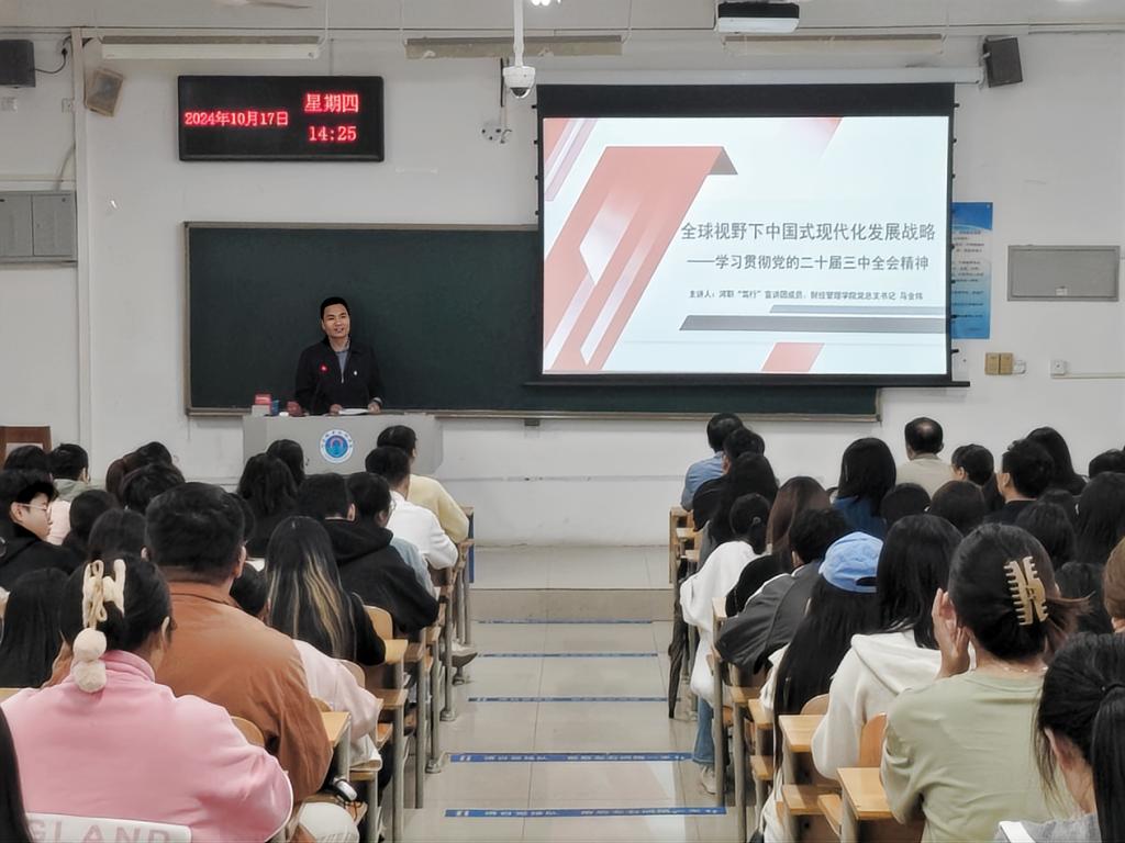为深入学习贯彻党的二十届三中全会精神,根据学校党委统一部署,10月17日下午,学校党的创新理论“笃行”宣讲团成员、财经管理学院党总支书记马金伟在1103教室为学院师生宣讲党的二十届三中全会精神,学院全体教师和120余名学生代表参会。