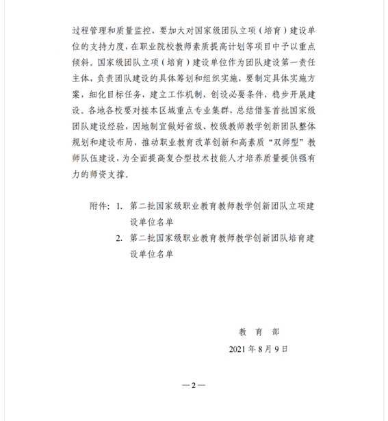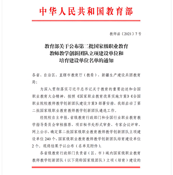 机电一体化技术专业于2021年8月获批国家级职业教育教师教学创新团队。