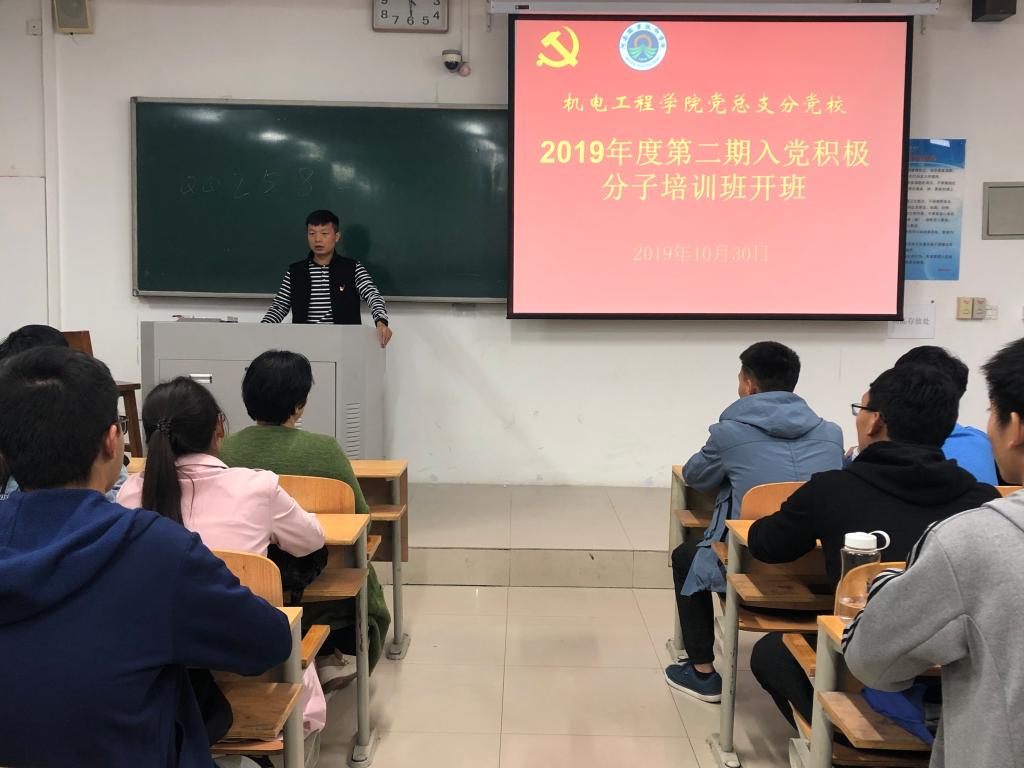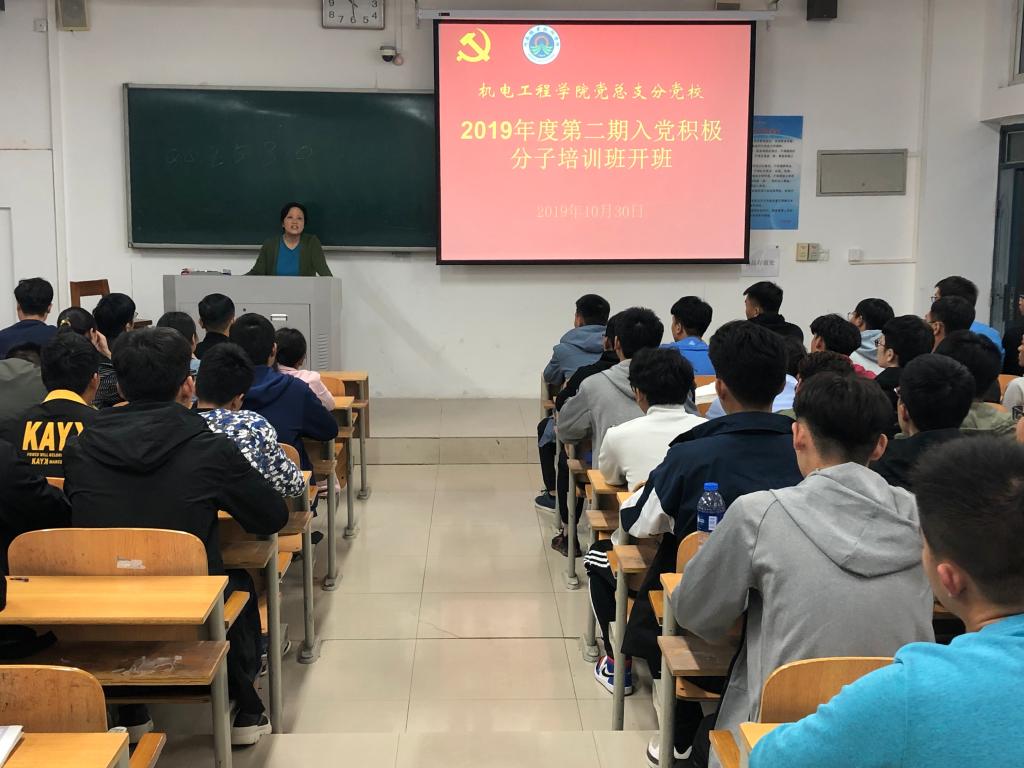 2019年10月30日,机电工程学院2019年度第二期入党积极分子培训班开班仪式在1105教室举行。党总支书记袁世先、副书记赵军华、学生党支部书记黄金磊和部分学生党员代表出席仪式,我院116名入党积极分子参加本次培训。仪式由学院学生党支部书记黄金磊老师主持。