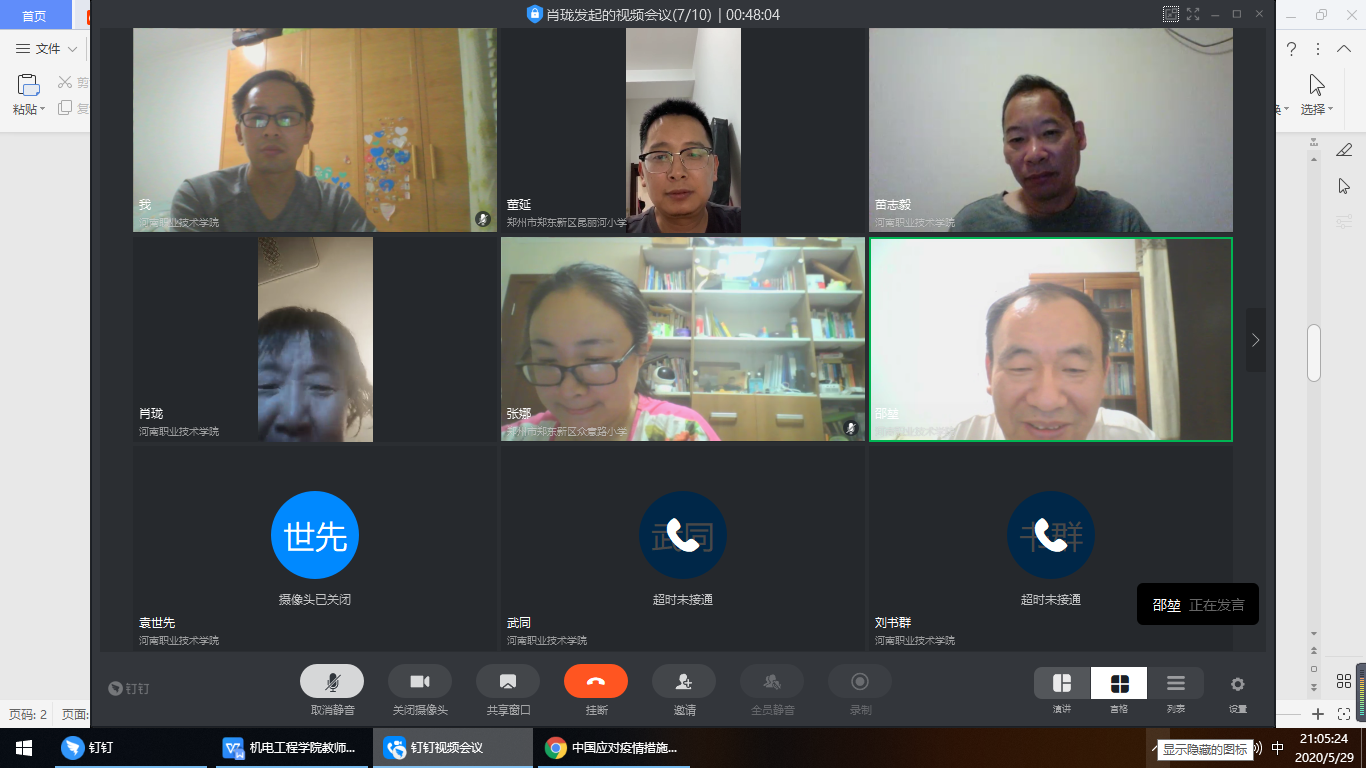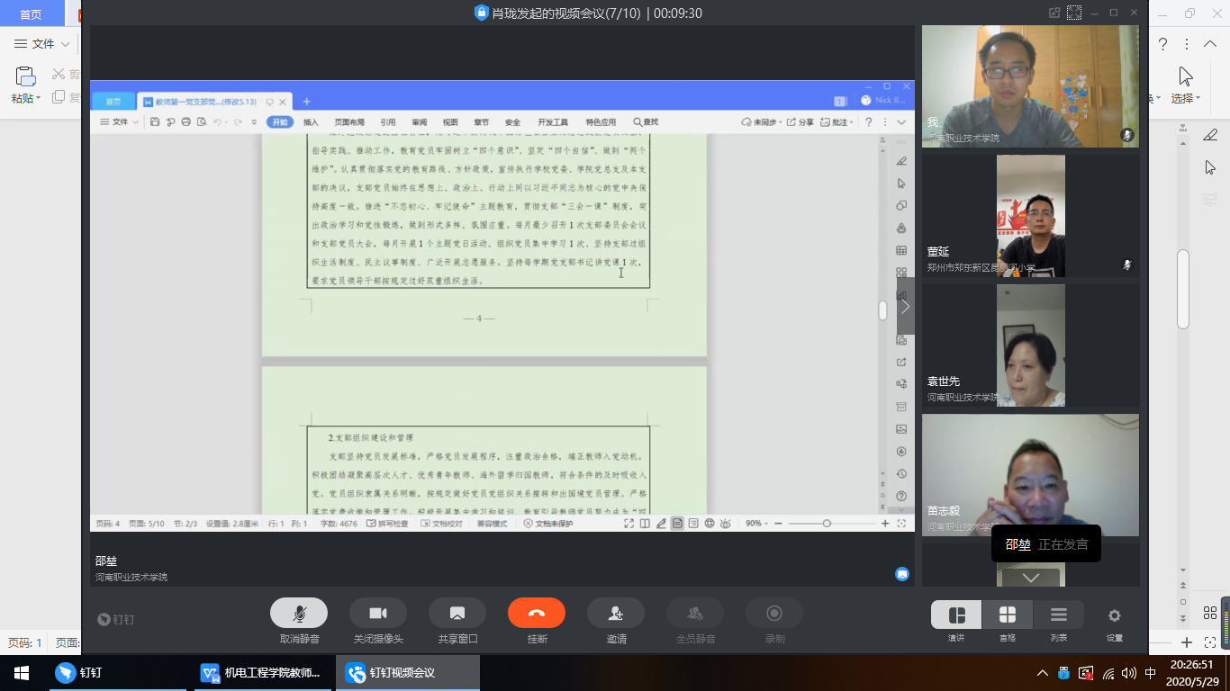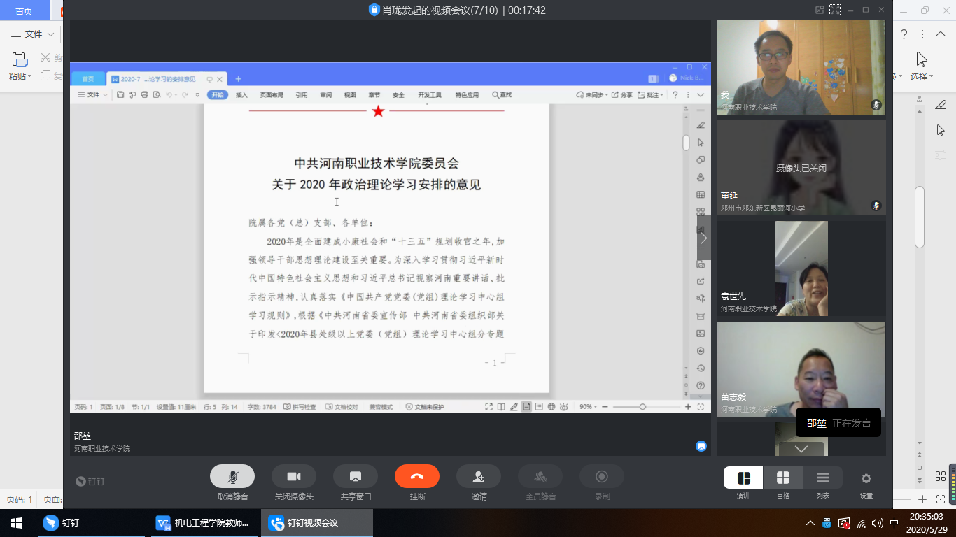 根据学院下发的关于组织学习2020年全国“两会”精神和习近平总书记作出的重要讲话精神的通知。5月29日晚8点,通过钉钉平台,机电学院教师第一党支部组织召开了视频会议,邵堃支部书记主持。
