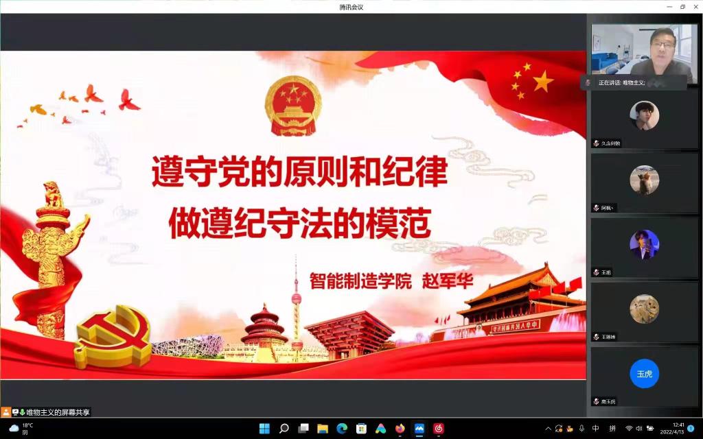 按照2022年度入党积极分子培训班教学计划,4月13日,智能制造学院党总支书记、分党校校长赵军华同志开展主题为《遵守党的原则和纪律 做遵纪守法的模范》的专题讲座,此次讲座通过腾讯会议直播的方式进行。