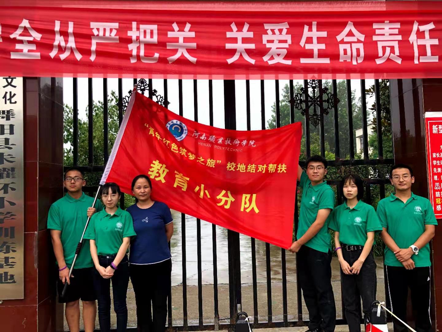 为进一步引导鼓励青年大学生扎根中国大地、了解国情民情,在创新创业中增长智慧才干,在艰苦奋斗中锤炼意志品质,接受革命传统教育,走好新时代青年的新长征路,机电工程学院组织创新创业小组的部分成员组成青年红色筑梦之旅教育小分队,由辅导员樊林带队,奔赴河南省舞阳县朱耀环小学开展社会实践活动,用创新创业成果服务乡村振兴战略、助力精准扶贫脱贫。