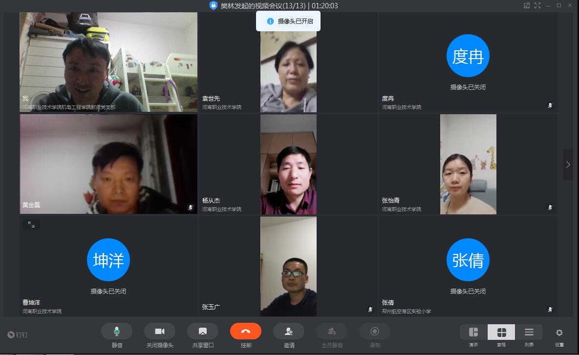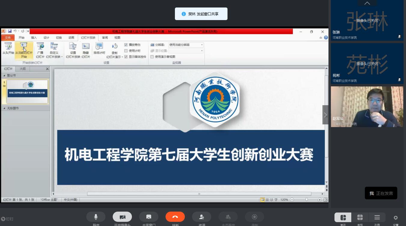 为学习贯彻习近平新时代中国特色社会主义思想和党的十九大精神,深入落实习近平总书记给“青年红色筑梦之旅”大学生重要回信精神,大力推动学校创新创业教育引领工程,打造创新创业教育升级版,激发学生创新创业热情,展示创新创业教育成果;同时为贯彻党中央、国务院关于做好新冠肺炎疫情防控工作决策部署,按照《河南职业技术学院关于举办第七届大学生创新创业大赛的通知》文件精神,4月25日,机电工程学院举行了第七届创新创业大赛。本次大赛在钉钉平台上采用视频会议方式进行,视频会议由创业专项负责人樊林主持。
