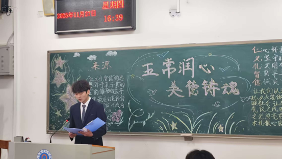 为深入传承中华优秀传统文化,弘扬“仁义礼智信”五常美德,引导学生树立正确价值观念,11月27日晚,智能制造学院在1203教室举行“五常润心·美德铸魂”主题演讲活动。本次活动面向大一大二全体学生,以演讲为桥梁,传递美德力量,推动传统伦理在新时代校园落地生根。