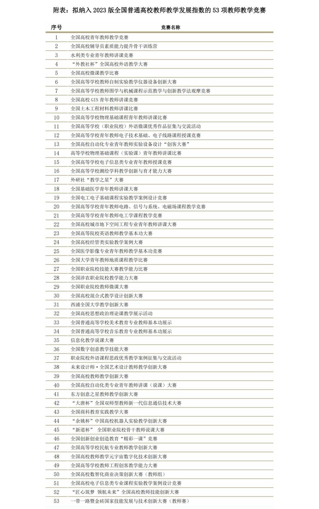 2022年9月30日,中国高等教育学会发布了关于征集高校教师教学竞赛的通知,通过竞赛主办方自愿申报、形式审查、初评和专家委员会审议等环节,共遴选出53项赛事列入2023年全国普通高校教师教学竞赛清单(见附表),并作为教学竞赛维度纳入2023版全国普通高校教师教学发展指数。