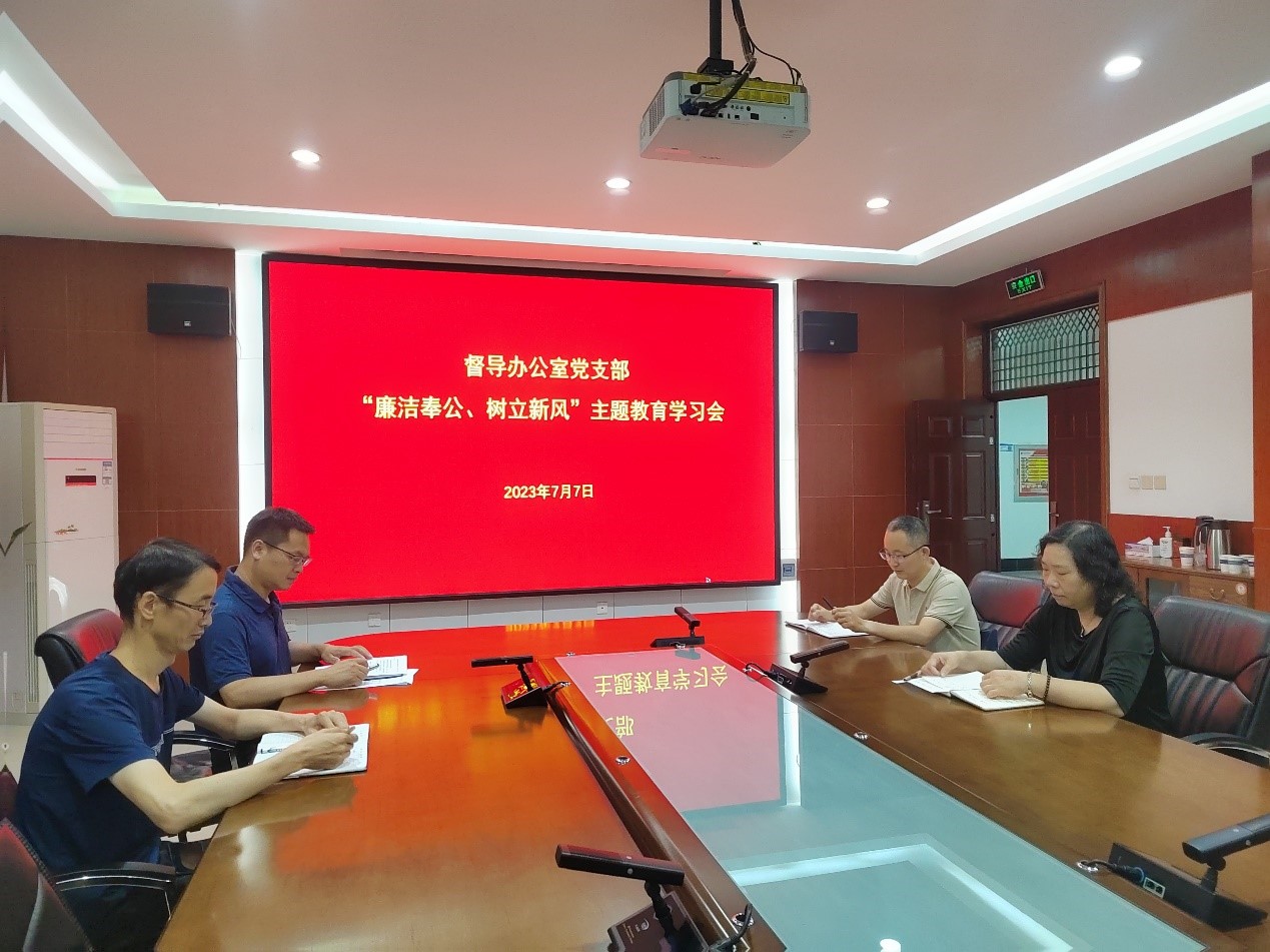 为深入贯彻习近平新时代中国特色社会主义思想主题教育,不断提高支部党员廉洁自律意识,筑牢拒腐防变思想防线,7月7日上午,督导办公室党支部开展主题教育学习会,本次学习会主题是“廉洁奉公树立新风”。督导办公室党支部全体党员参加。