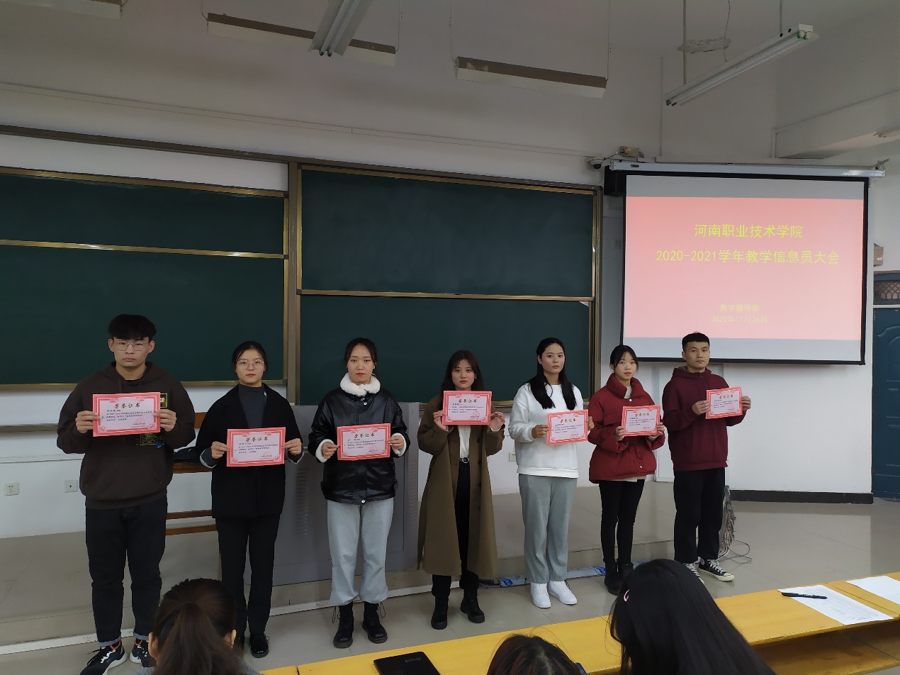 会上,周宗杰主任宣读了《河南职业技术学院关于表彰2019-2020学年“优秀教学信息员”的决定》和《河南职业技术学院关于聘任2020-2021学年教学信息员的通知》,他代表学院向获奖优秀教学信息员表示祝贺,对新聘任教学信息员表示欢迎,并向他们颁发了荣誉证书和聘书。周主任在随后的讲话中指出,教学信息员是教师、学生之间沟通的桥梁,教学信息反馈是学院及时了解课堂教学情况的主要途径,教学信息员队伍是我院教学质量监控体系的重要组成部分,在提高学院教育教学质量中发挥着重要作用。希望大家在今后的工作中继续努力,充分发挥主观能动性,以高度的责任感为学院教学质量的提高做出贡献。