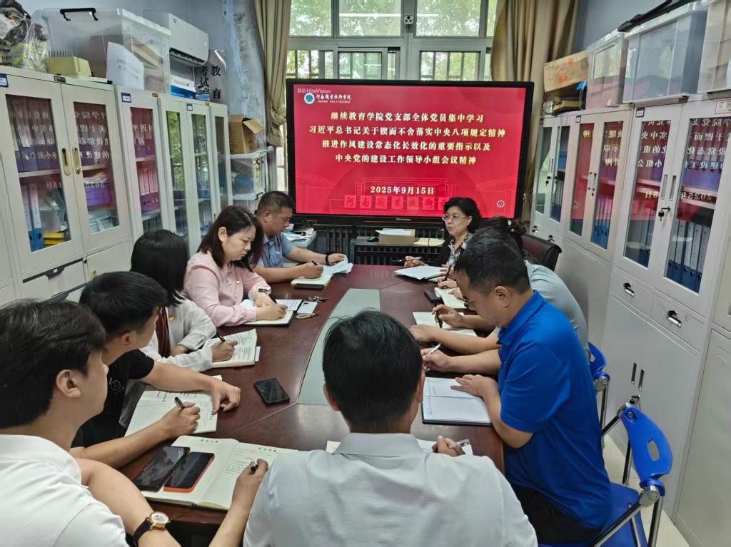 9月15日,继续教育学院党支部全体党员在勤业楼126室进行了集中学习,深入学习习近平总书记关于锲而不舍落实中央八项规定精神、推进作风建设常态化长效化的重要指示以及中央党的建设工作领导小组会议精神。本次学习活动由党支部书记王黎明主持。